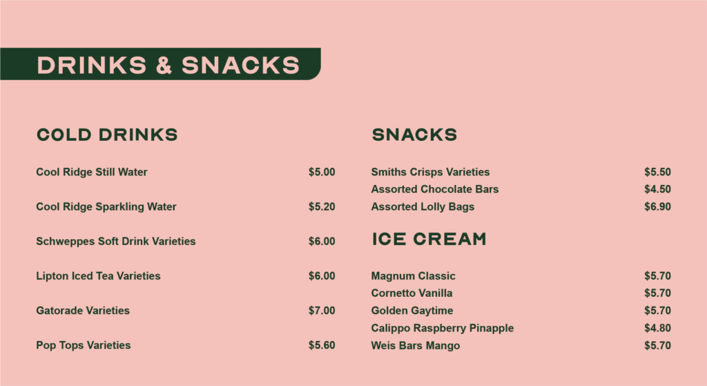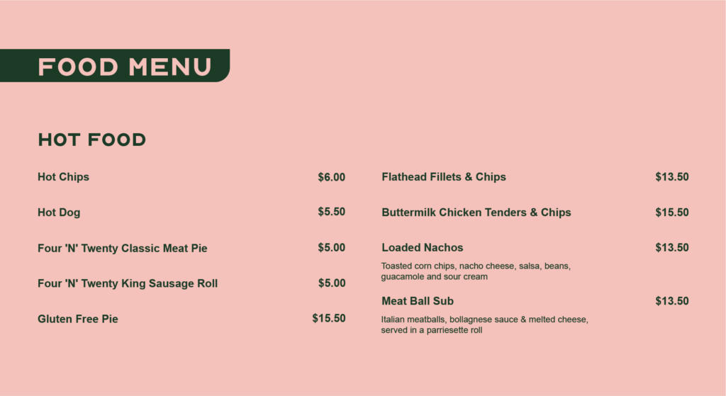 Choose from Flathead Fillets & Chips, crowd-favourite Chicken Tenders and Chips, Loaded Nachos with toasted corn chips and nacho cheese, Italian Meat Ball Sub, a classic Hot Dog, golden Hot Chips, or a comforting Meat Pie and Sausage Roll.